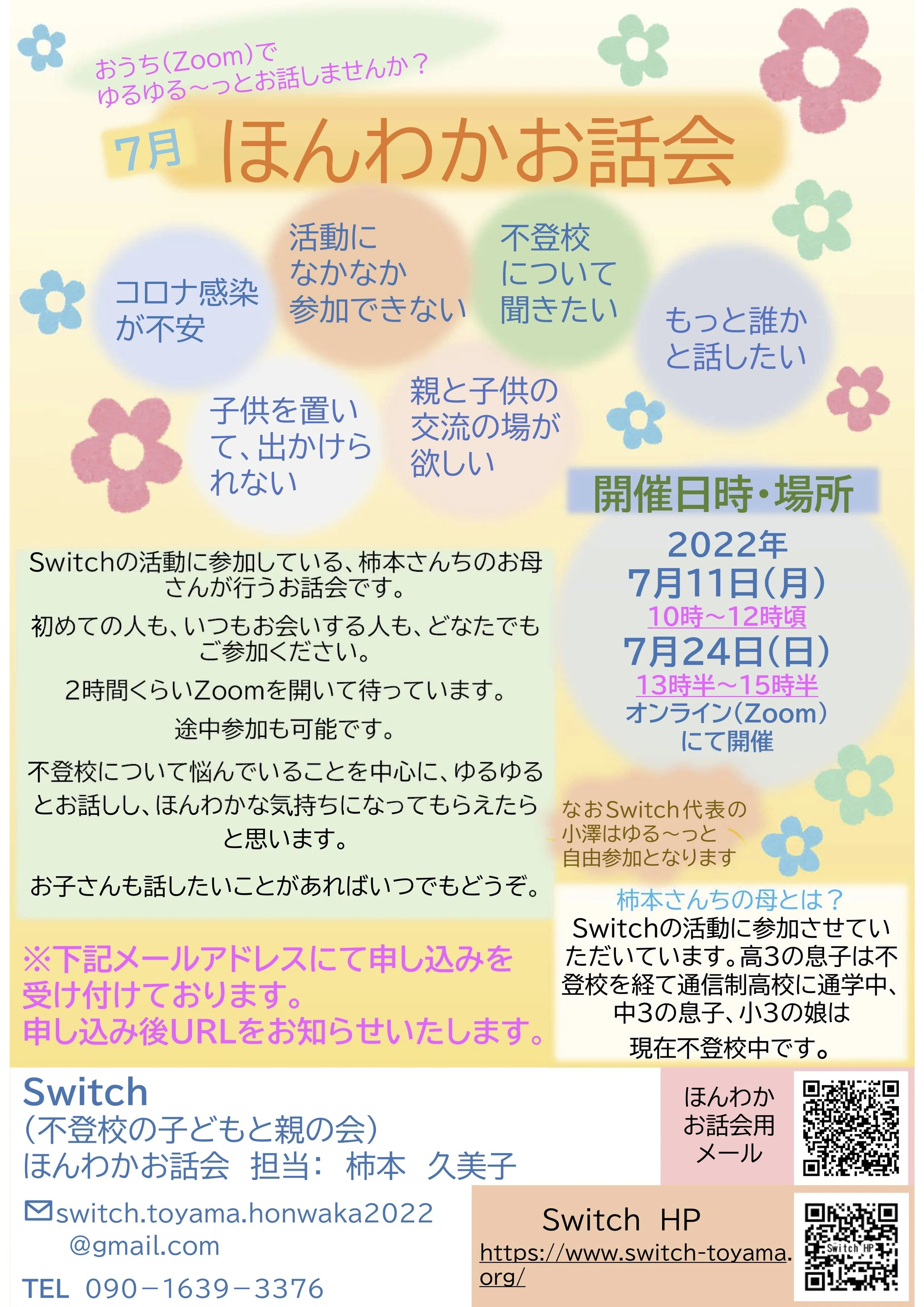 6月のほんわかお話会は、Switch初参加、ほんわかは初めて、いつも参加してるよ等々、様々な方に参加していただきました。私自身、わからないことや、どうお伝えしたらよいのかな?と思うことも多々あるため、色々な人のお話を聞くことで、新たな学びを得られていると思います。皆様、ありがとうございました。