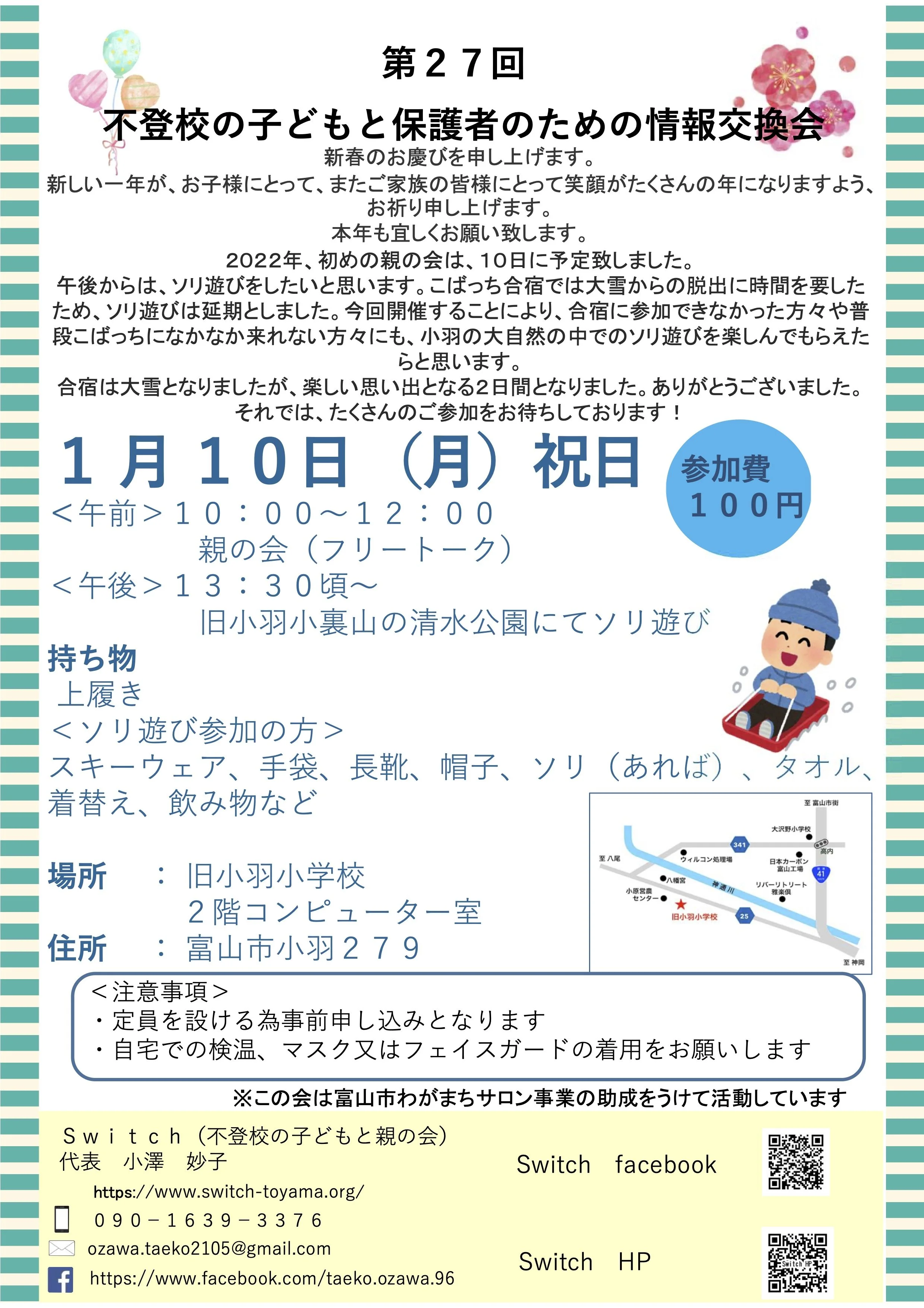 13:30〜15:30 小羽小の裏山でソリ遊びをしよう!(小羽にお住まいの平沢さんにご案内いただきます)