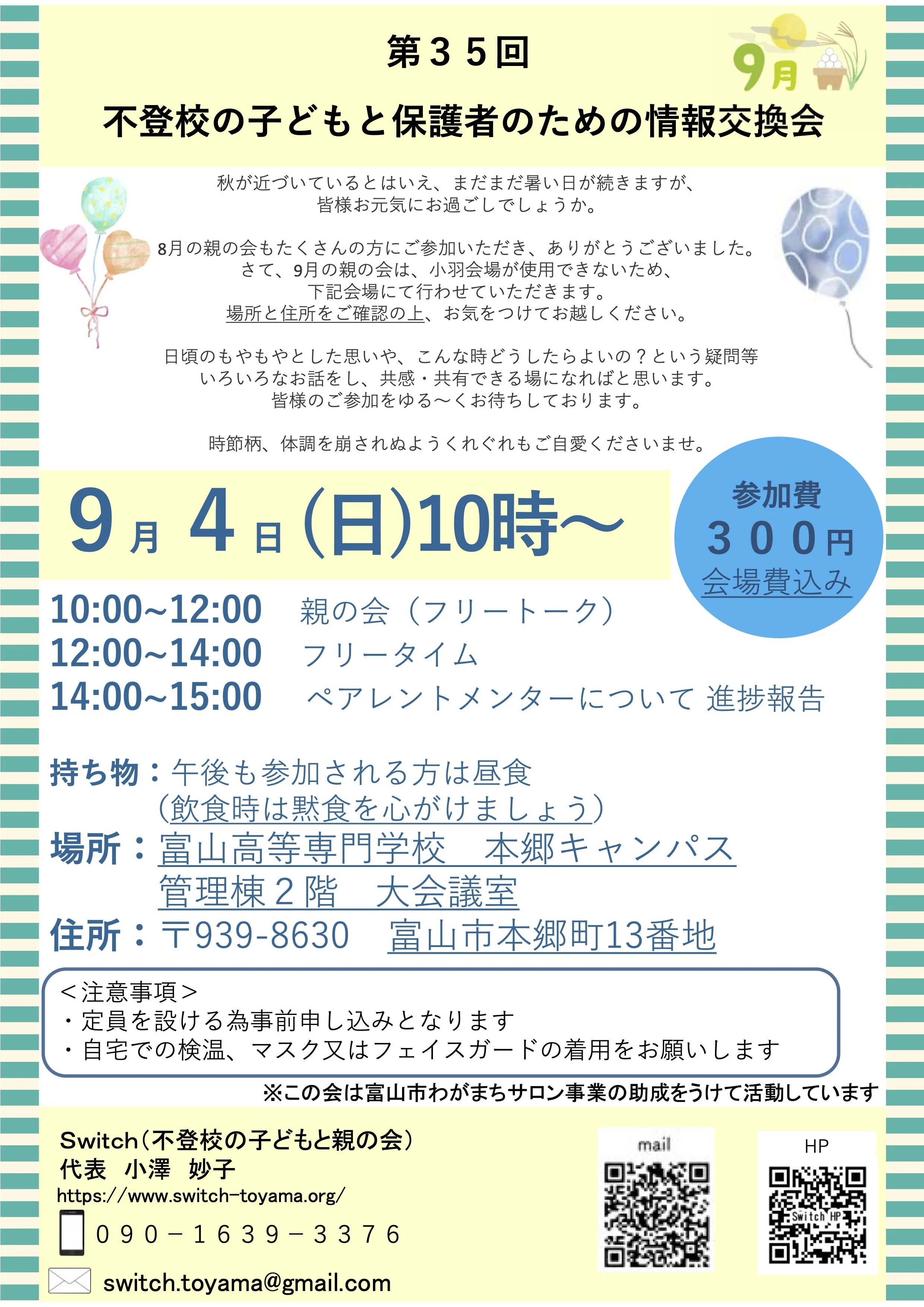 ※9月の親の会は会場が異なりますのでご注意下さい!