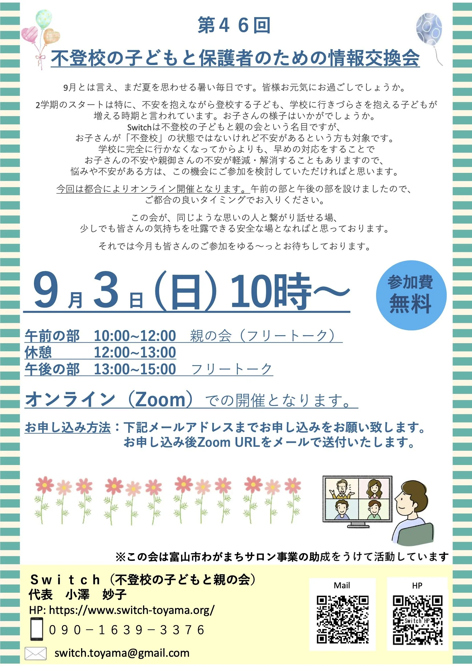 ※9月の「親の会」は都合によりオンライン開催となりますのでご注意下さい。