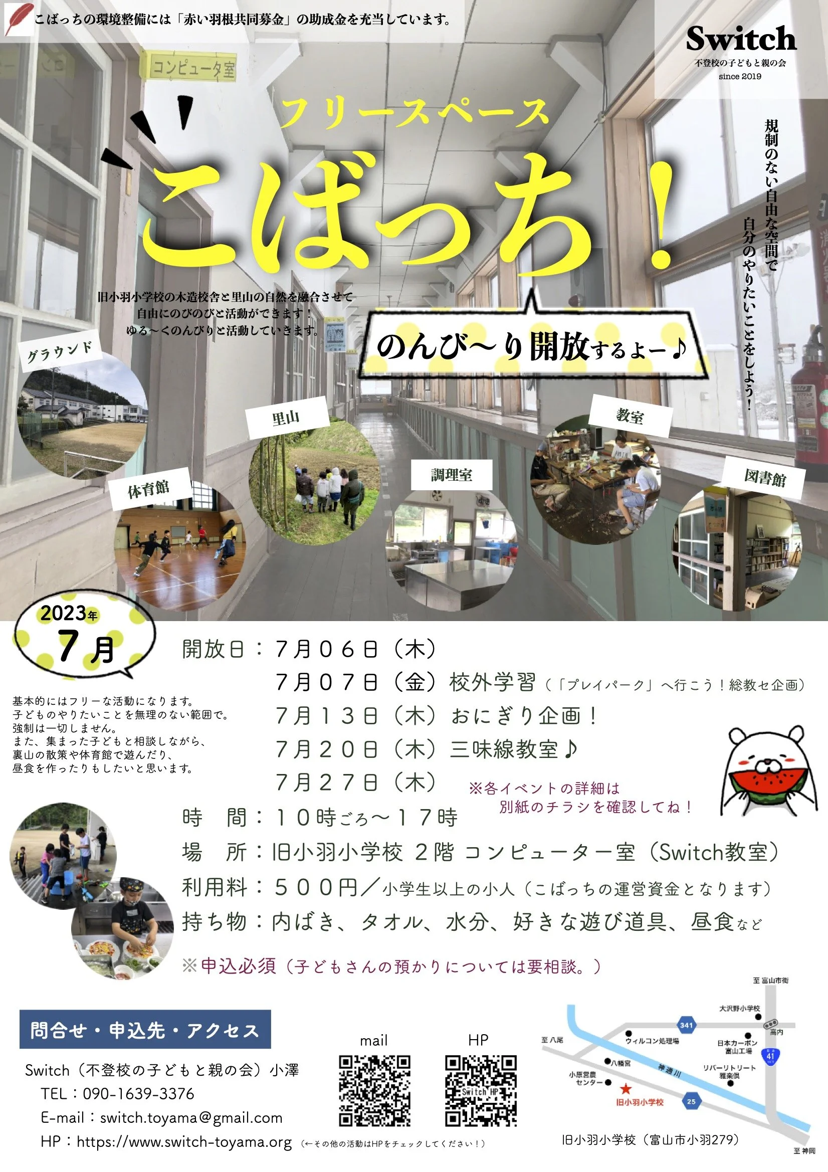 Switchの多様な学びの拠点としている旧小羽小学校のSwitchの教室(2階コンピューター室)を開放しています。名付けて「フリースペース こばっち!」です。(名称は変更になるかも(笑))
