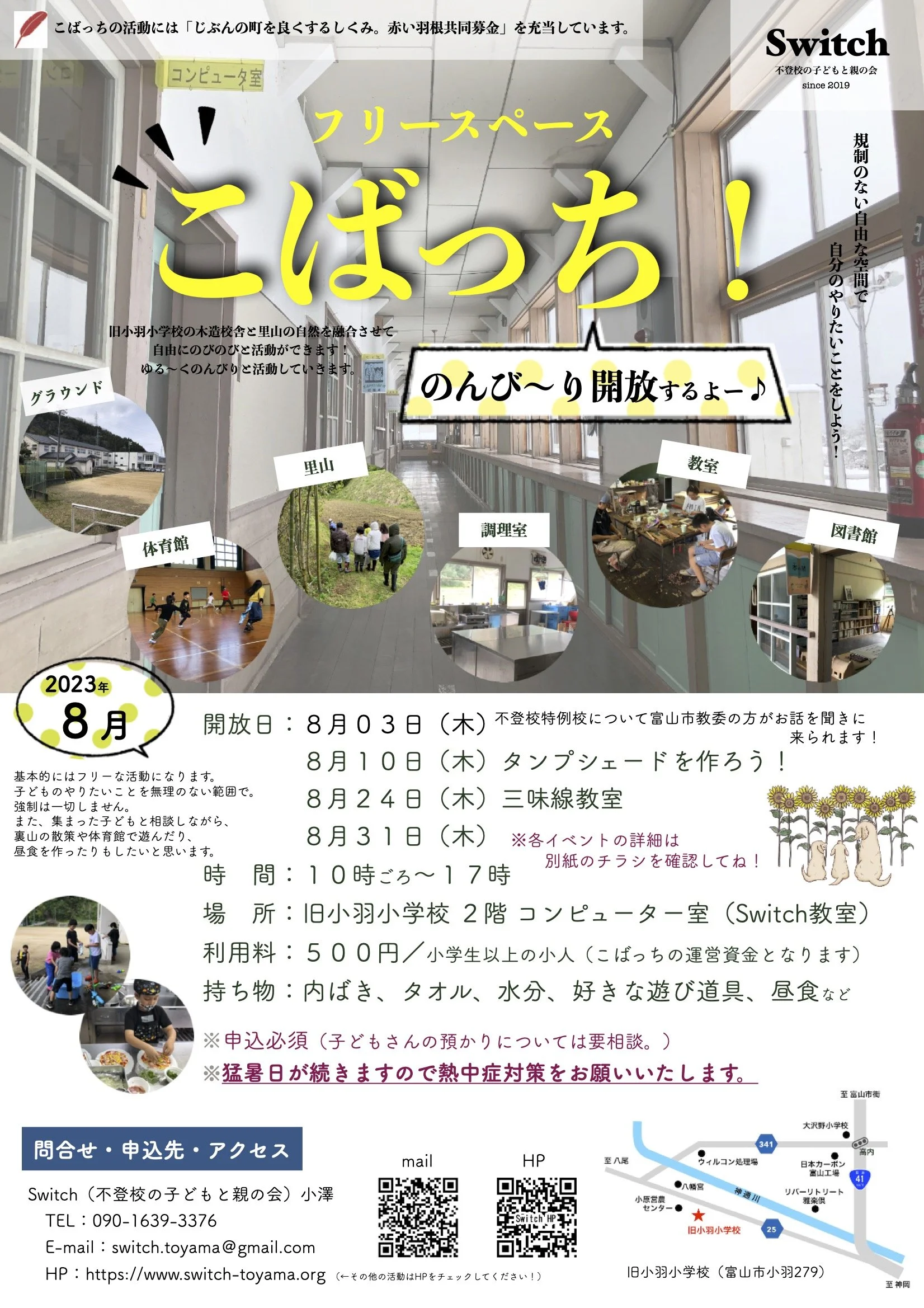 Switchの多様な学びの拠点としている旧小羽小学校のSwitchの教室(2階コンピューター室)を開放しています。名付けて「フリースペース こばっち!」です。(名称は変更になるかも(笑))
