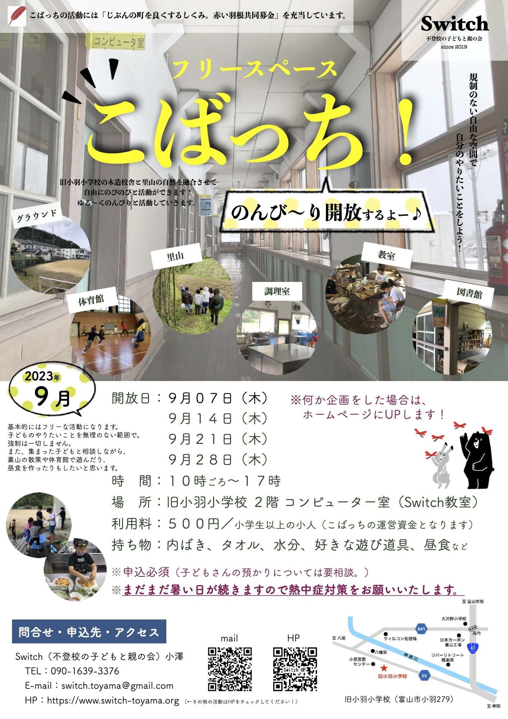 Switchの多様な学びの拠点としている旧小羽小学校のSwitchの教室(2階コンピューター室)を開放しています。名付けて「フリースペース こばっち!」です。(名称は変更になるかも(笑))