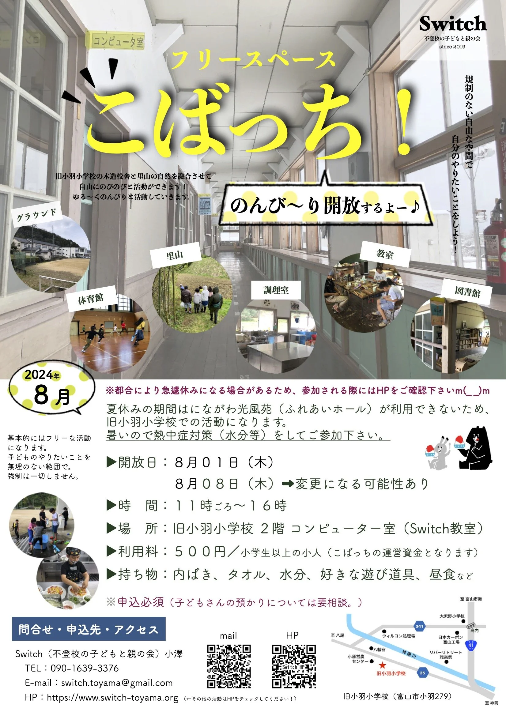 Switchの多様な学びの拠点としている旧小羽小学校のSwitchの教室(2階コンピューター室)を開放しています。名付けて「フリースペース こばっち!」です。