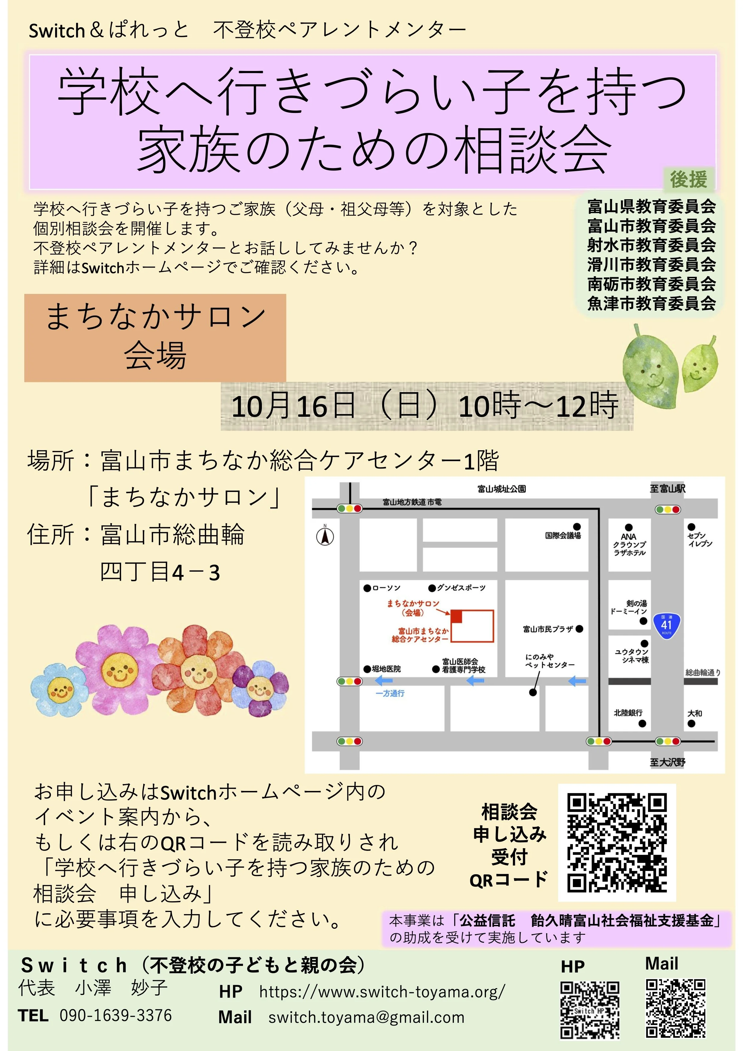 当相談会を含む不登校ペアレントメンター活用事業は、「公益信託 飴久晴富山社会福祉支援基金」の助成を受けて実施しています。