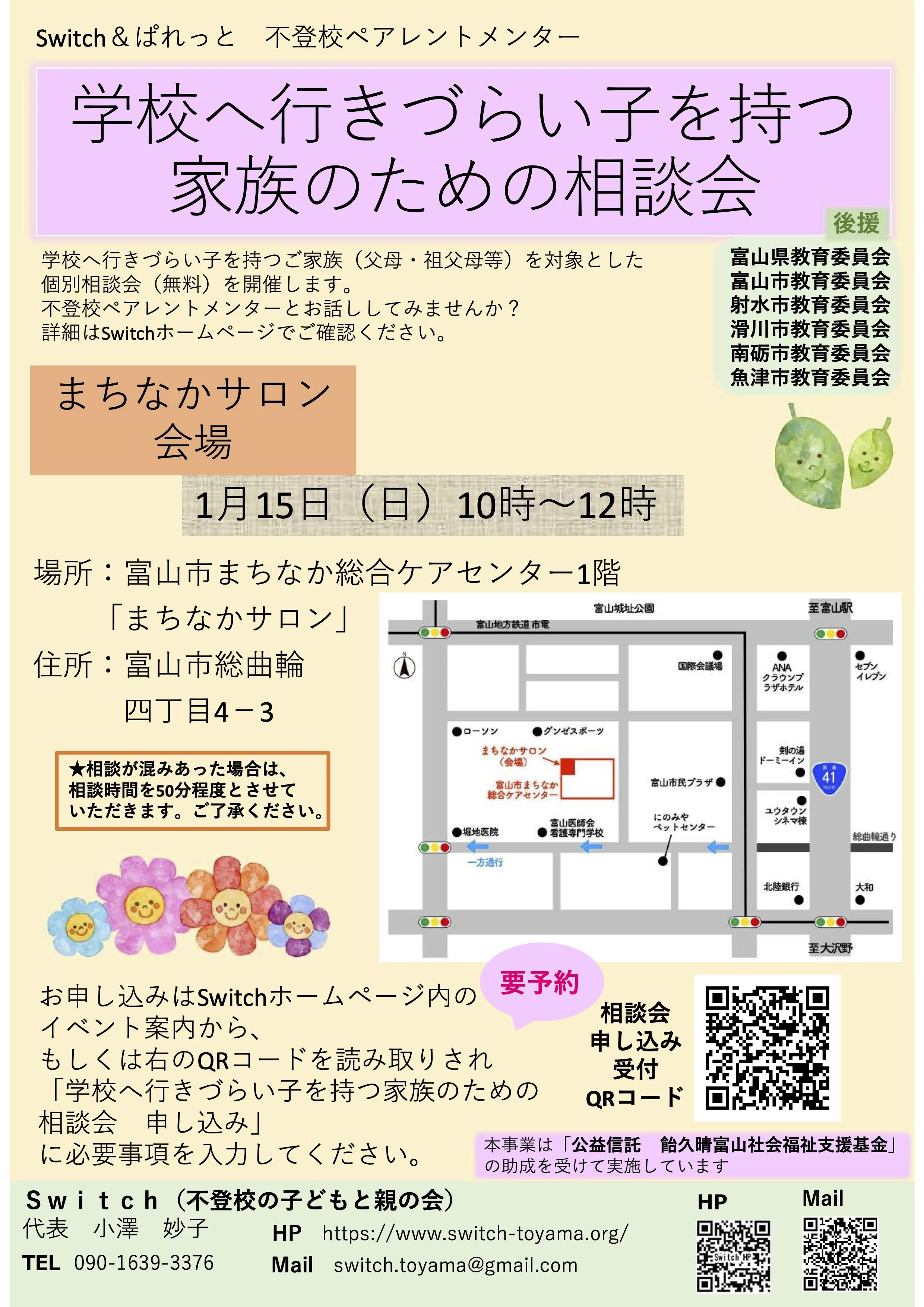 当相談会を含む不登校ペアレントメンター活用事業は、「公益信託 飴久晴富山社会福祉支援基金」の助成を受けて実施しています。