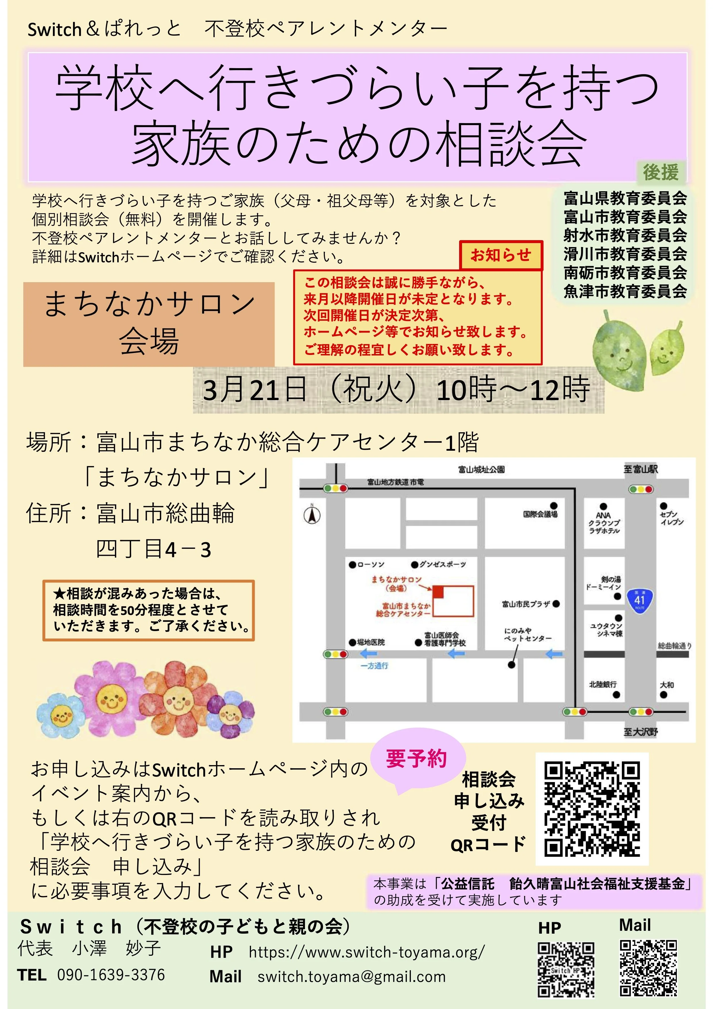 当相談会を含む不登校ペアレントメンター活用事業は、「公益信託 飴久晴富山社会福祉支援基金」の助成を受けて実施しています。