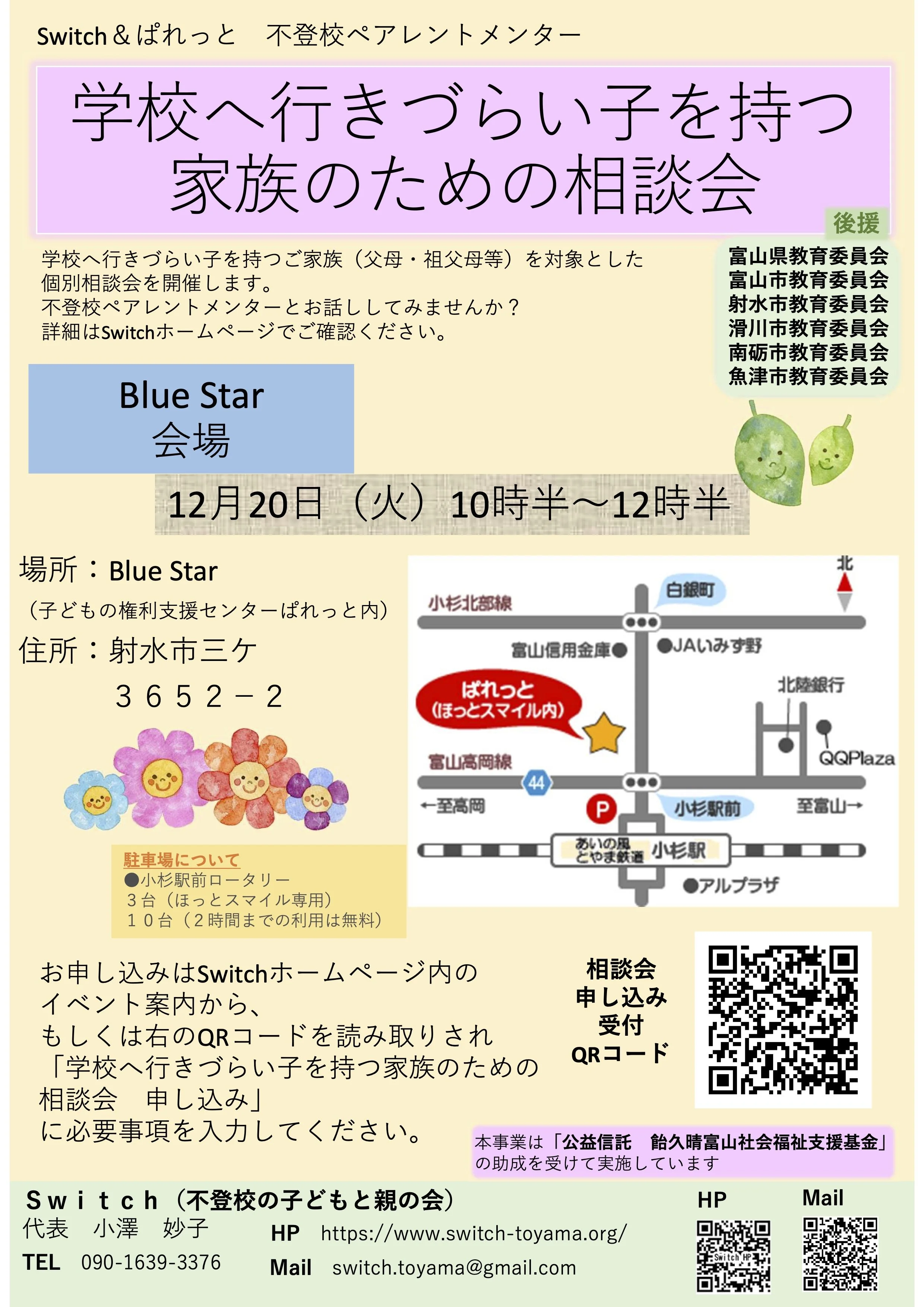 当相談会を含む不登校ペアレントメンター活用事業は、「公益信託 飴久晴富山社会福祉支援基金」の助成を受けて実施しています。