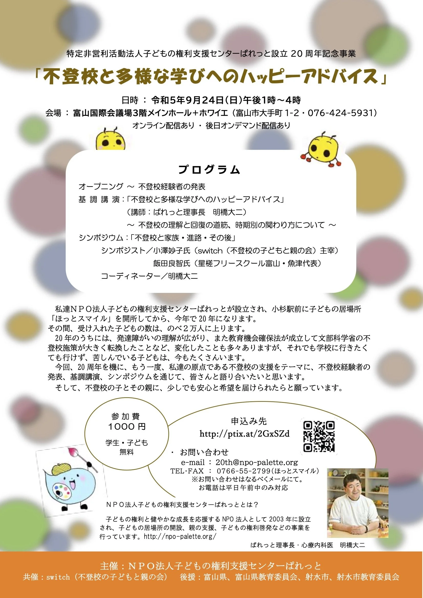 不登校ペアレントメンター養成・活用事業において協働して下さった「特定非営利活動法人子どもの権利支援センターぱれっと」さんの設立20周年記念事業として、「不登校と多様な学びへのハッピーアドバイス」が以下の日程で開催されます。